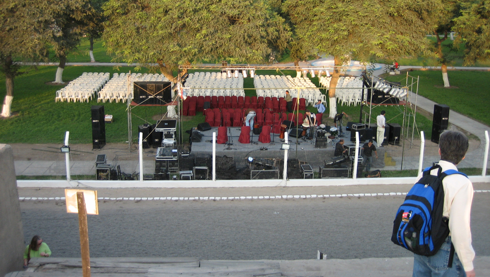 The U.S. Embassy sponsored this outreach concert in a very poor area of Lima — they provided an outdoor stage, lighting and a sound system for the show, and a charter bus to the gig. The stage was set up in front of some ruins, called a huaca, that had served as a storage area on the Inca trail. The “green room” for the musicians was the building archeologists used to clean and inspect the artifacts found at this site. Before the sound check we explored the huaca, hung out in the garden under avocado trees, and checked out the exotic spiders on the huge cacti.